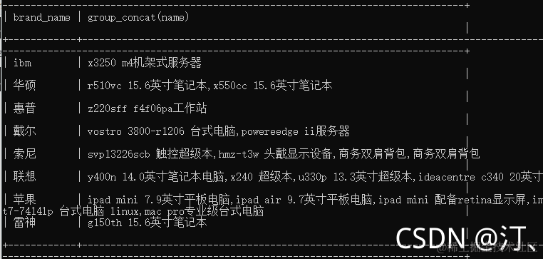 select brand_name,group_concat(name) from goods group by brand_name;
