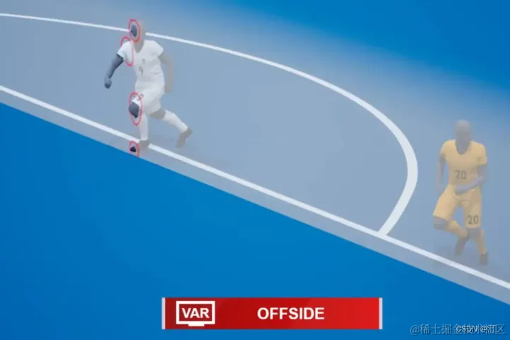 随后,视频助理裁判会视情况与场上主裁判沟通。待主裁判判罚完成后,半自动越位识别系统会生成 3D 动画图像,在场内大屏幕以及电视机上播放,来更直观地展示球员越位的具体位置。