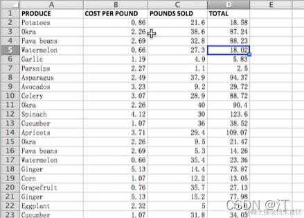 - 每一行代表一次单独的销售。列分别是销售产品的类型(A)、产品每磅的价格(B)、销售的磅数(C),以及这次销售的总收入(D)。TOTAL列已经设置为 Excel公式,将每磅的成本乘以销售的磅数,并将结果取整到分。有了这个公式,如果列 B 或 C 发 生变化,TOTAL 列中的单元格将自动更新。