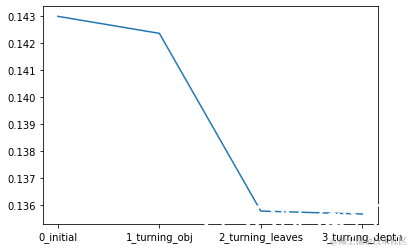 sns.lineplot(x=['0_initial','1_turning_obj','2_turning_leaves','3_turning_depth'], y=[0.143 ,min(best_obj.values()), min(best_leaves.values()), min(best_depth.values())])