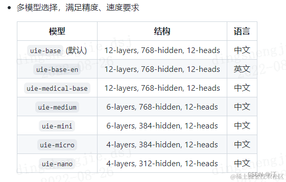 schema:定义任务抽取目标,可参考开箱即用中不同任务的调用示例进行配置。batch_size:批处理大小,请结合机器情况进行调整,默认为1。model:选择任务使用的模型,默认为uie-base,可选有uie-base,uie-medium,uie-mini,uie-micro,uie-nano和uie-medical-base,uie-base-en。position_prob:模型对于span的起始位置/终止位置的结果概率在0~1之间,返回结果去掉小于这个阈值的结果,默认为0.5,span的最终概率输出为起始位置概率和终止位置概率的乘积。precision:选择模型精度,默认为fp32,可选有fp16和fp32。fp16推理速度更快。如果选择fp16,请先确保机器正确安装NVIDIA相关驱动和基础软件,确保CUDA>=11.2,cuDNN>=8.1.1,初次使用需按照提示安装相关依赖。其次,需要确保GPU设备的CUDA计算能力(CUDA Compute Capability)大于7.0,典型的设备包括V100、T4、A10、A100、GTX 20系列和30系列显卡等。更多关于CUDA Compute Capability和精度支持情况请参考NVIDIA文档:GPU硬件与支持精度对照表。