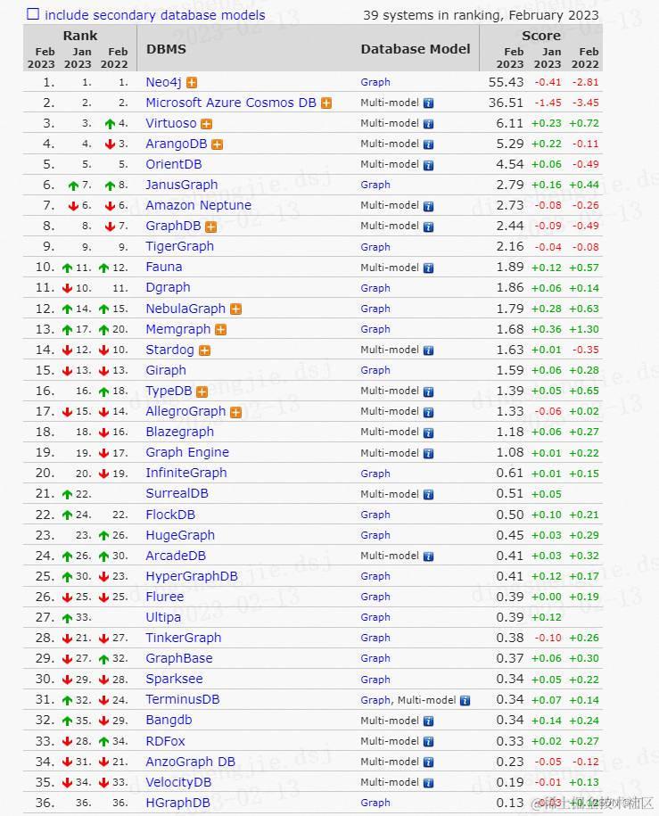 3.知识图谱业务落地技术推荐之图数据库汇总 汀丶人工智能 2023-03-08 60 阅读1分钟 0.图数据库排名 链接:db-engines.com/en/ranking/… 0.1简要分析(各种图数据库属性) Neo4j(主流) 历史悠久且