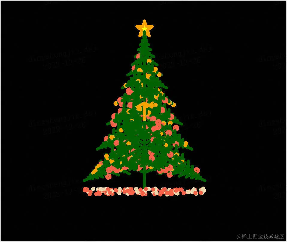 作为最后一个版本,效果当然是这几个版本中最贴近于真实圣诞树的,装饰品、平安果,圣诞节礼物要啥有啥,此外漫天雪花、黑夜背景也被绘制出来了
