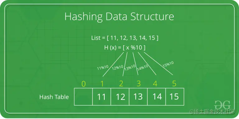 让哈希函数 H(x) 将值 x 映射到数组中索引 x%10 处。例如,如果值列表是 [11, 12, 13, 14, 15],它将分别存储在数组或哈希表中的位置 {1, 2, 3, 4, 5}。