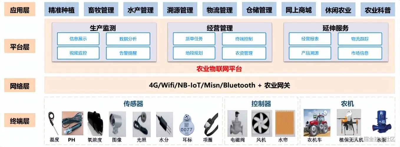 应用层包括智慧种植、智慧家畜养殖、智慧水产养殖、农产品溯源、智慧粮食存储等典型应用,如下图所示。