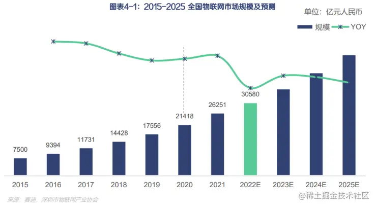 中国物联网市场规模目前处于稳步上升阶段,十三五期间,年均复合增长率达到23.4%。2020年,疫情促进了数字化转型步伐,同比增长率明显上扬。2022年,在国际形式不稳定,国内疫情连绵的背景下,全国物联网市场规模同比增长率有所下滑。