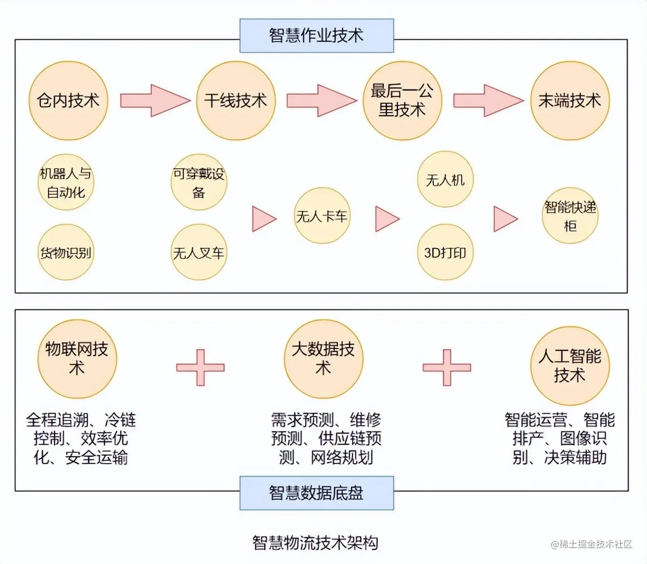 从智慧物流系统的物流业固有属性来看,智慧物流系统主要由仓内技术、干线技术、最后一公里技术和末端技术组成。仓内技术主要应用于物流系统的应用层,实现物流自动分类分拣和机器搬运;干线技术主要是指无人驾驶卡车技术;最后一公里技术是末端配送中重要的一项技术;末端技术主要是指智能快递柜。智慧物流系统的数据底盘主要包括物联网、大数据和人工智能三大领域。智慧物流的技术架构下图所示。