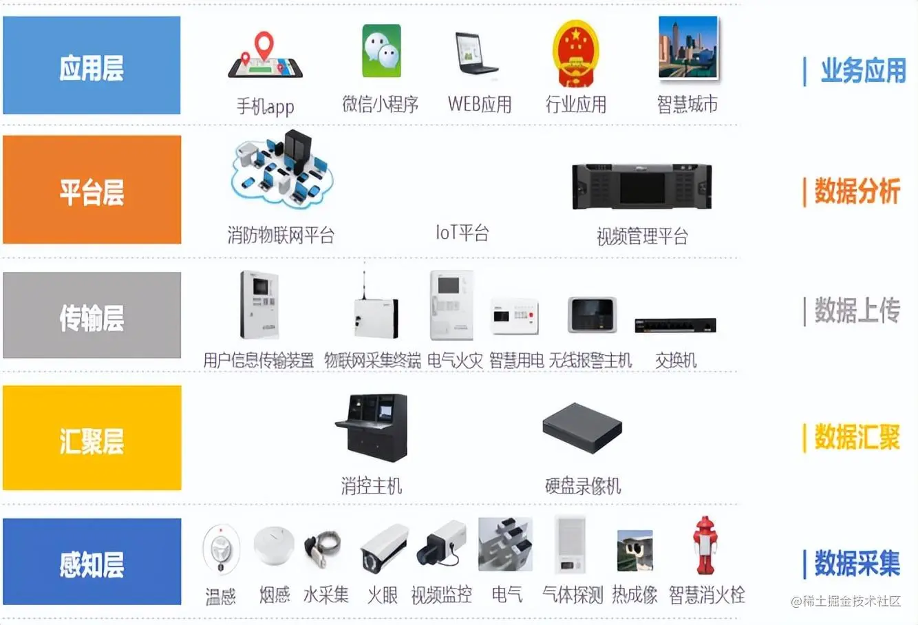 智慧消防核心由应用、平台、传输、汇聚及感知五层架构组成,其中应用及平台两层构成智慧消防的头部应用,传输层由智慧消防的无线传输设备构成,汇聚层及感知层由原传统消防的底层能力构成。