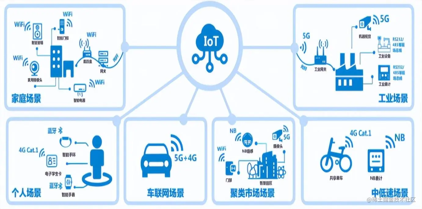 目前,物联网的连接场景主要分为六大应用场景:①家庭场景,像智能音箱、智能门锁、智能摄像头、网关等智能硬件。②工业场景,像智能水表、智能电表、工业设备监控装置等智能硬件。③个人场景,像智能手环、智能手表、电子学生卡等智能穿戴设备。④车联网场景,像行车卫士等产品。⑤聚类市场场景,主要指智慧园区、智慧社区的建设,包含烟感、门禁、摄像头等智能硬件。⑥中低速场景,像生活中的智能单车、智能充电桩。