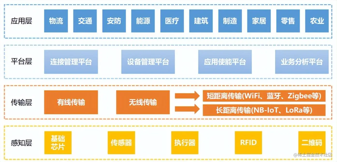 那么物联网有哪些技术特征呢?众所周知,物联网可以分为四个层级,包括感知层、传输层、平台层、应用层。