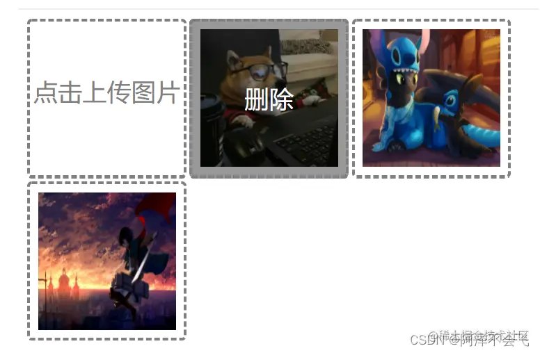 前端运用原生js来实现多图片的上传,并可以实现预览,队列删除,添加的效果。实现图片上传前的可控制化的效果,效果图如下: