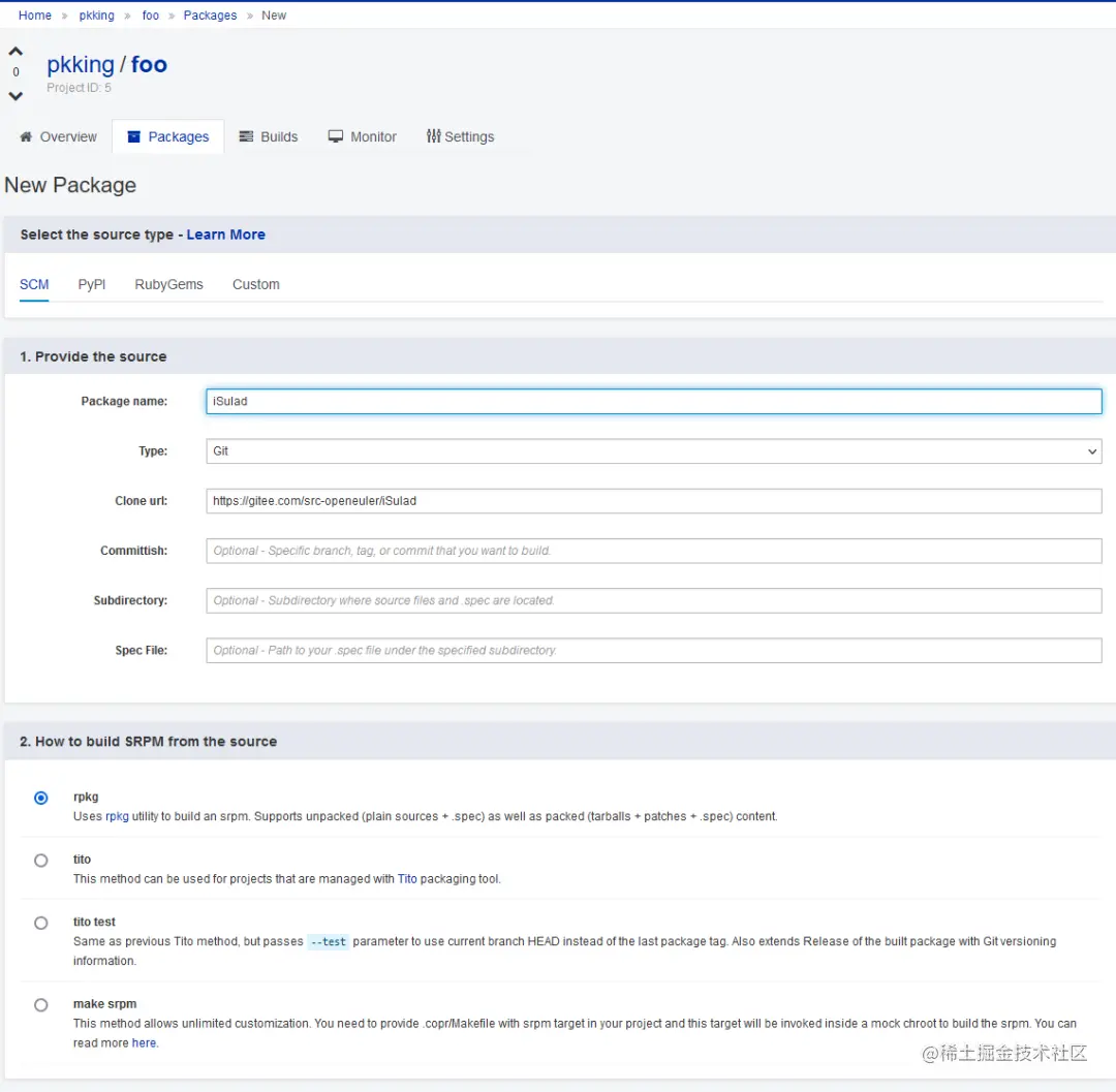 这里我们直接添加openEuler的isulad软件包,因为其已经包含构建所需要的spec和源码包。