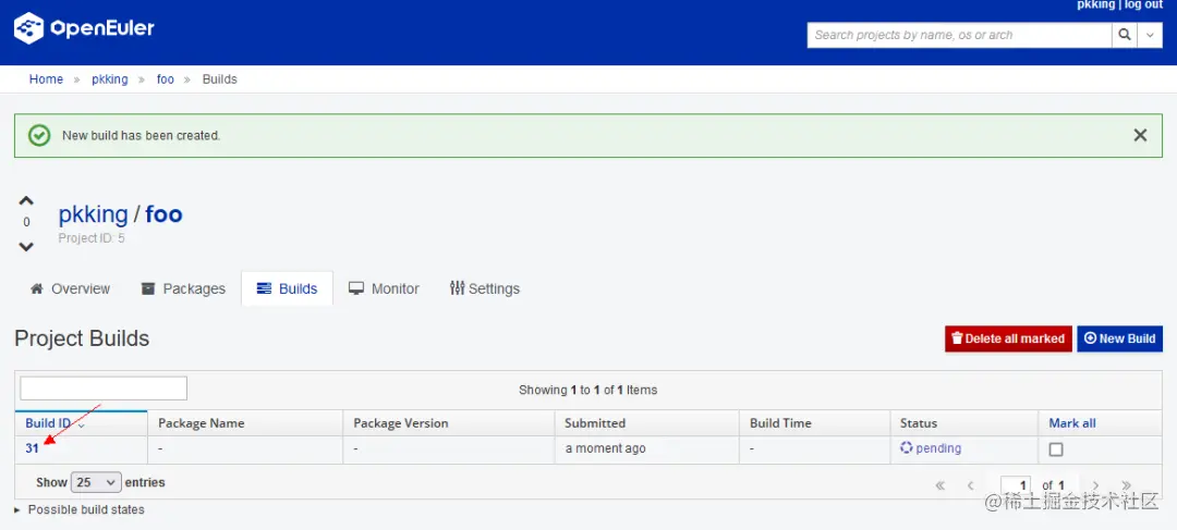 再次点击Build,后台构建系统就会开始构建你的软件包,通过点击任务id,可以实时观看任务的日志。