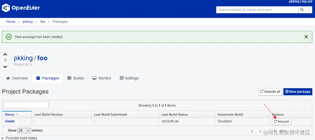 软件包创建完成后,点击rebuild即可触发一次构建。