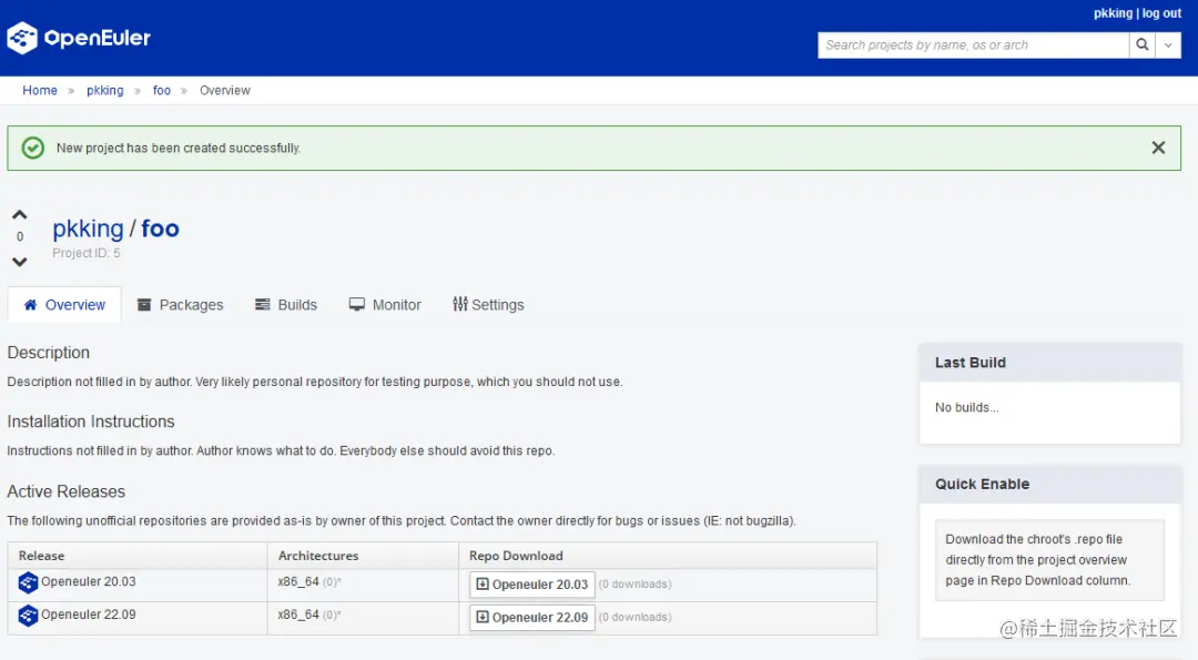 项目:每个用户可以创建多个项目,项目用于组织一个或多个软件包,每个项目可以针对这组软件包生成针对各个openEuler版本的软件包仓库;
