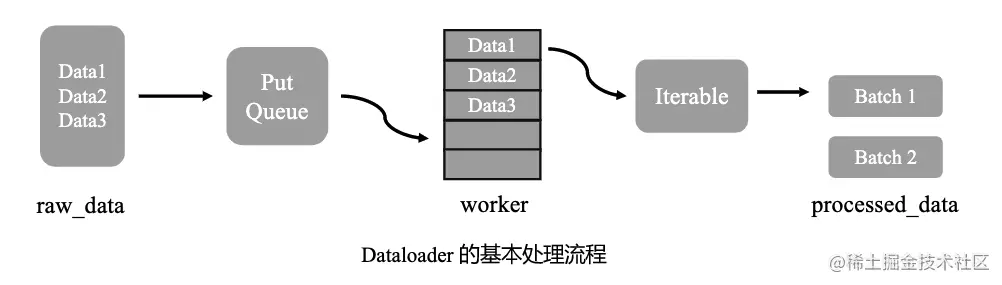 在使用 MegEngine 进行模型训练时,首先要进行的是数据加载和预处理。在此过程中,MegEngine 中的megengine.data模块,提供了数据分批功能,其内部实现流程如下图: