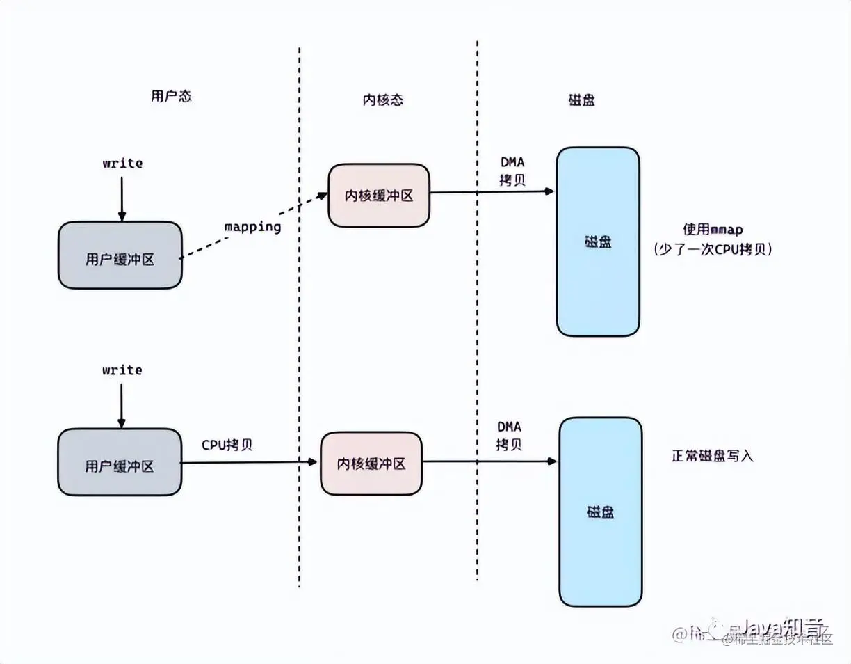 使用mmap技术之后,可以减少一次的CPU拷贝次数,提升性能。