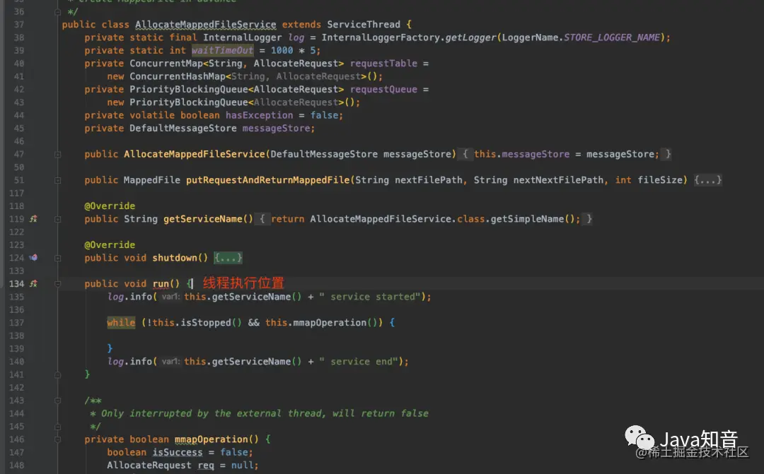 下边让我们来看看RocketMQ底层是如何进行mmap的文件映射预分配的。在RocketMQ的源代码中,当服务启动之后,AllocateMappedFileService这个线程类便会开始执行。