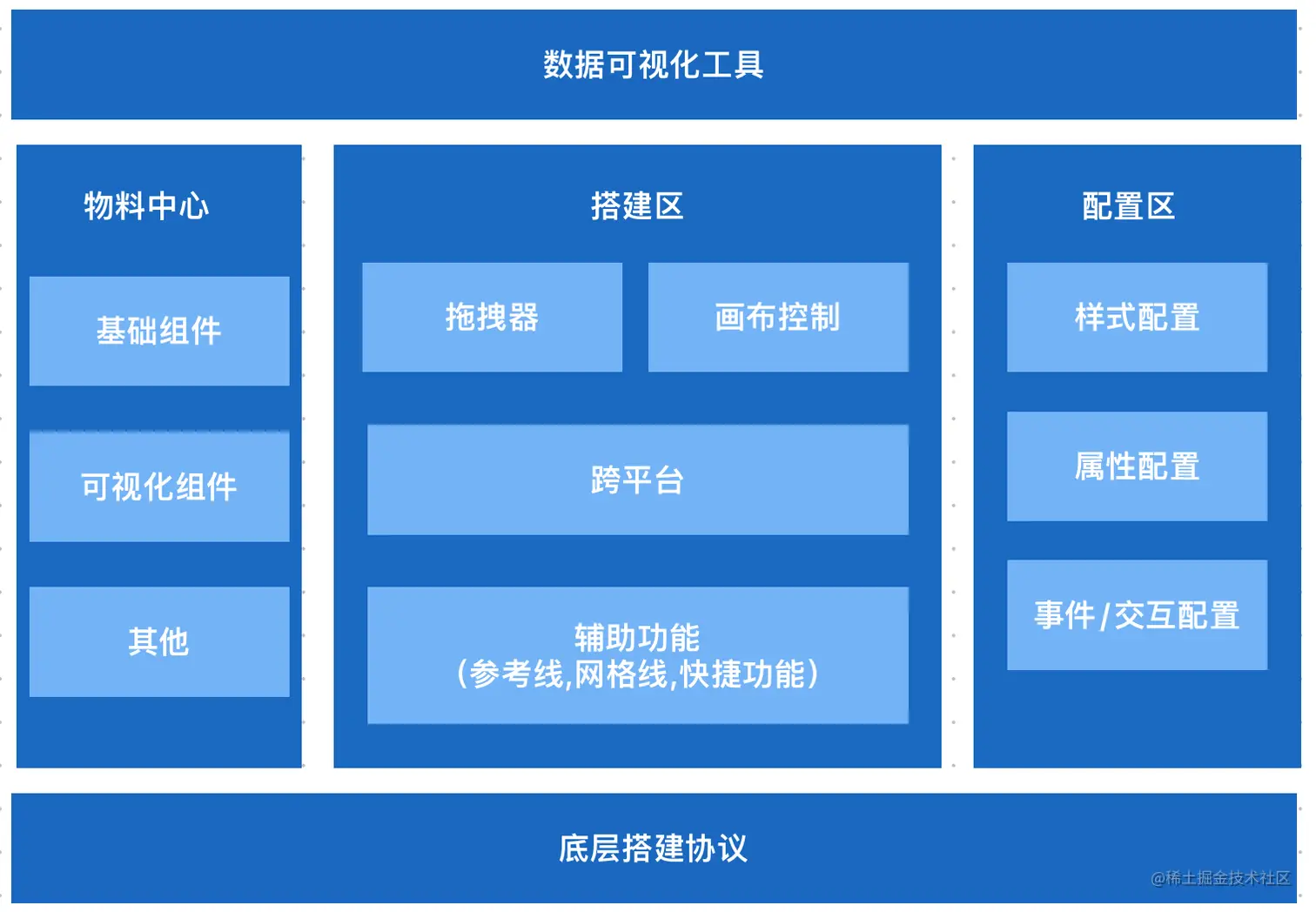 按照功能我们可以把配置时前端进行如图的模块分层。数据可视化工具前端页面一般包括物料区、搭建区和配置区三部分。