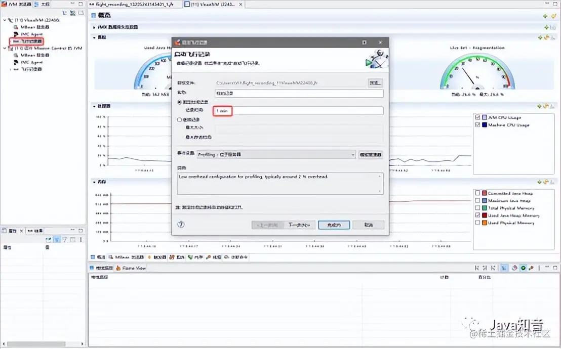 通过连接到远程JVM进程后,可以执行飞行记录(FlightRecord),选择飞行记录存放的路径与执行时间即可,如下图所示。需要注意的是,执行飞行记录功能时会对当前JVM进程有一定的性能影响(大约为5%~10%),所以建议JMC连接隔离环境中的服务器并执行飞行记录功能。