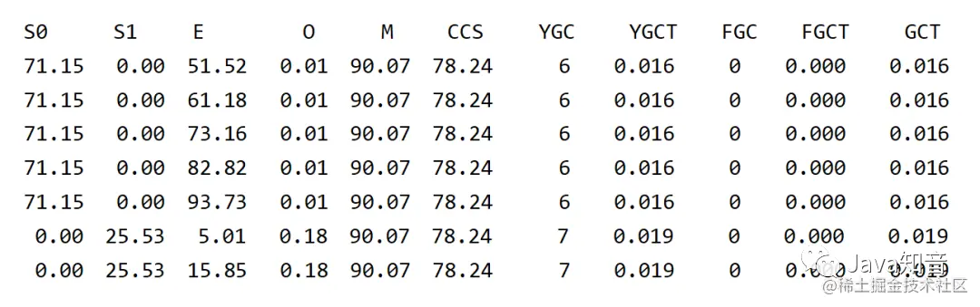 - -gc,类似gcutil,gcutil以百分比形式显示内存的使用情况,gc显示的是内存占用的字节数,以KB的形式输出堆内存的使用情况。