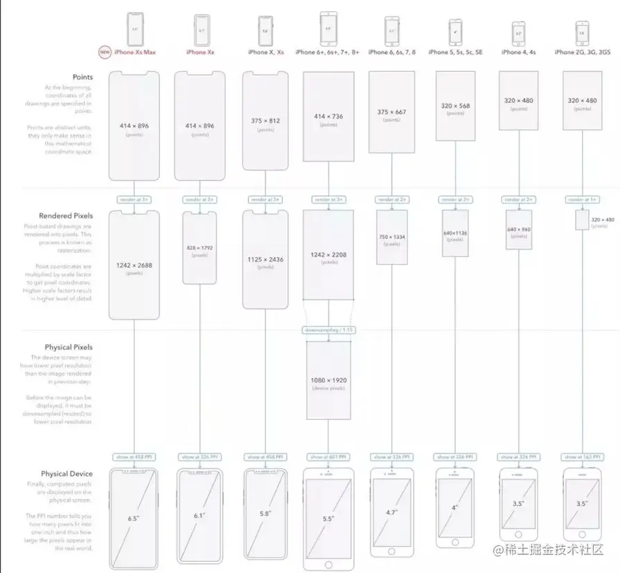 以 iPhone XS 为例,当写 CSS 代码时,针对于单位 px,其宽度为 414px & 896px,也就是说当赋予一个 DIV元素宽度为 414px,这个 DIV 就会填满手机的宽度;
