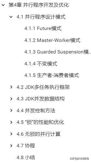 主要包括: 并行程序设计模式、JDK多任务执行框架、JDK并发数据结构、并发控制方法、 “锁”的性能和优化、无锁的并行计算、协程