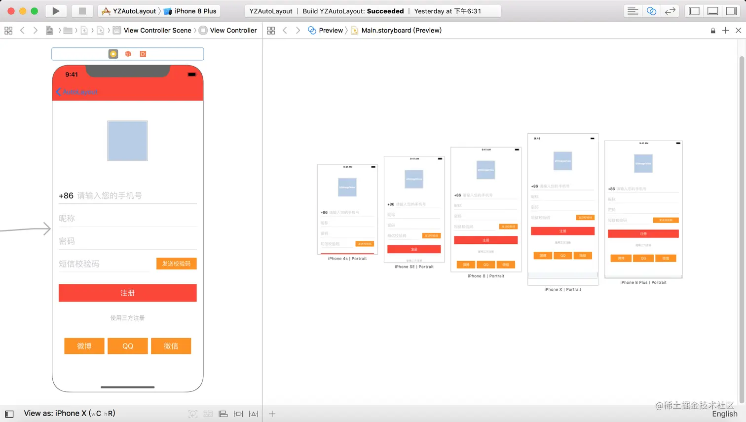 在使用AutoLayout来对UIScrollView进行约束的时候,我建议将UIScrollView的subviews分为多个模块,以注册页面为例,可将UIScrollView的subviews分为三个模块,
