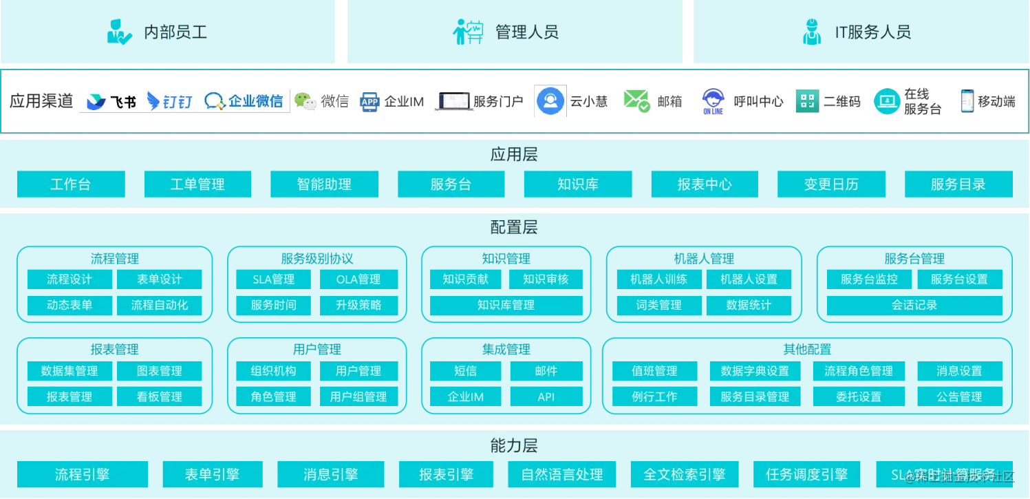 用户通过知识库检索相关知识。通过智能机器人问答的方式获取问答知识。自助提单时,自动推荐相关知识。IT服务人员通过知识库检索相关知识,服务台坐席根据聊天内容推荐知识,工单处理过程中根据工单内容推荐知识。