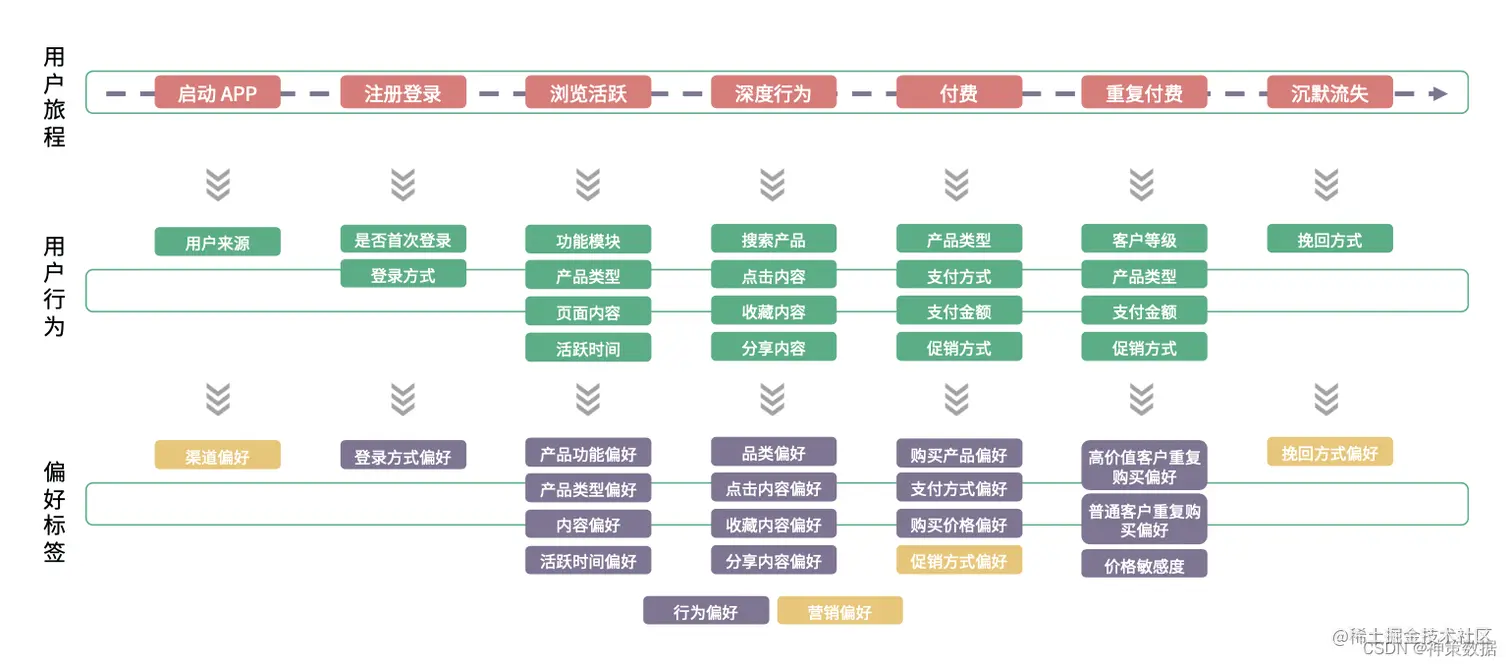 第六,基于用户兴趣分层。用户兴趣分为长期偏好、短期偏好、泛化偏好。其中,长期偏好和短期偏好又分为行为偏好和营销偏好两类,通过用户旅程中的触点梳理相应的用户行为,进而构建相关的用户偏好属性标签,继而根据平台的业务目标制定对应的运营策略。