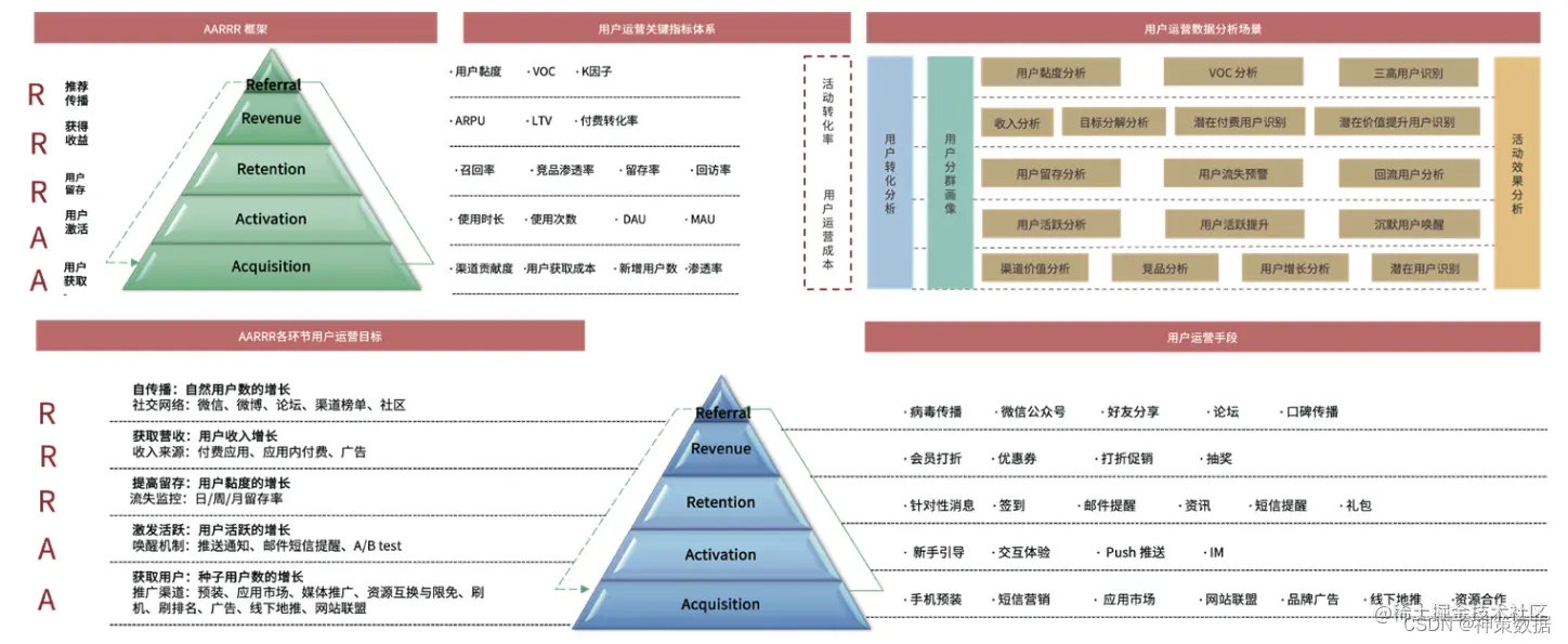 第二,AARRR 模型分层。将用户在产品中的行为路径与 AARRR 模型中的各环节一一对应,确定各阶段相应的用户群体,基于 AARRR 转化漏斗模型找出问题所在,制定产品运营策略,包括活动、内容、权益、产品等,提升各层级之间的转化效率。