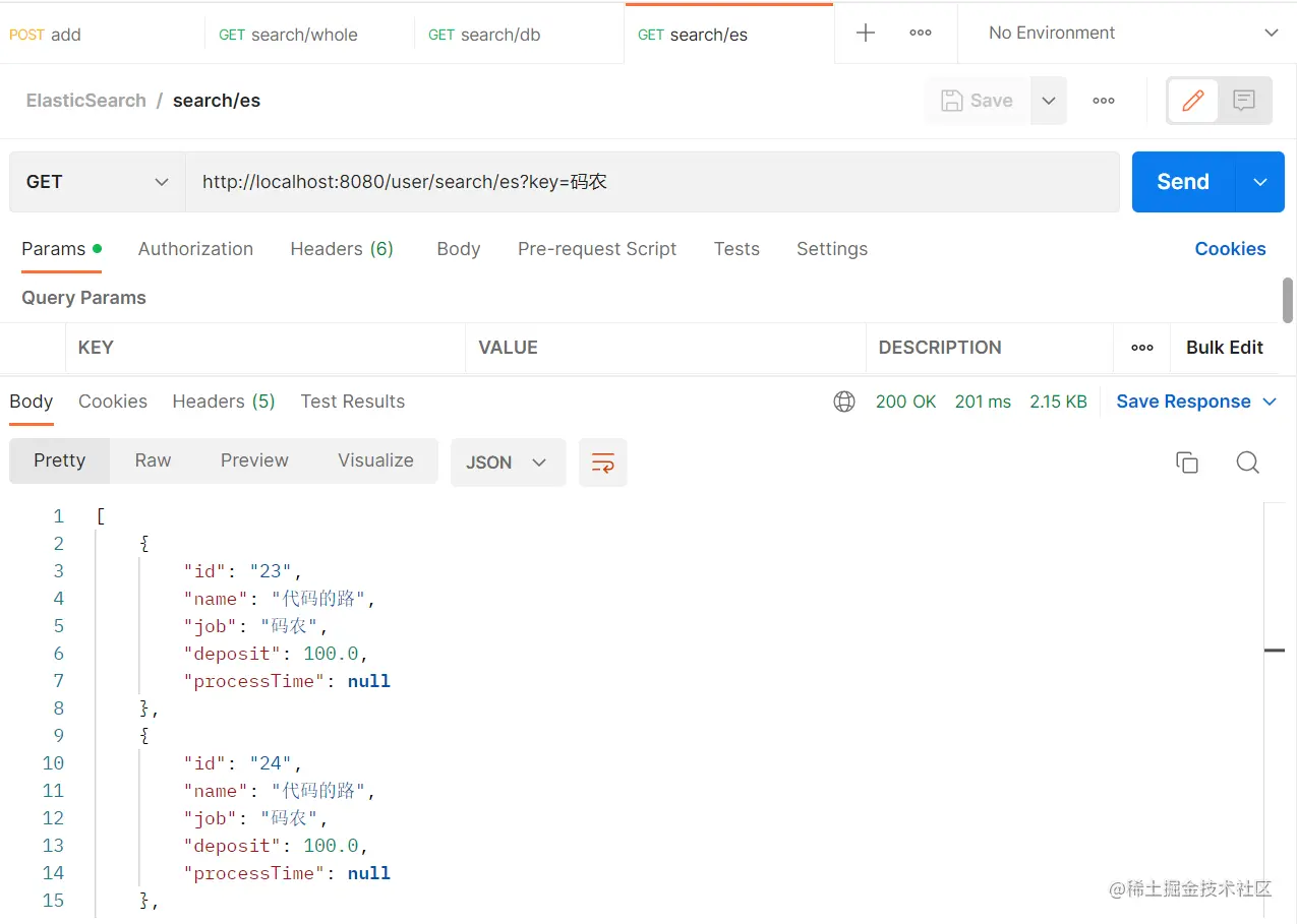 运行读取接口:http://localhost:8080/user/search/es?key=码农