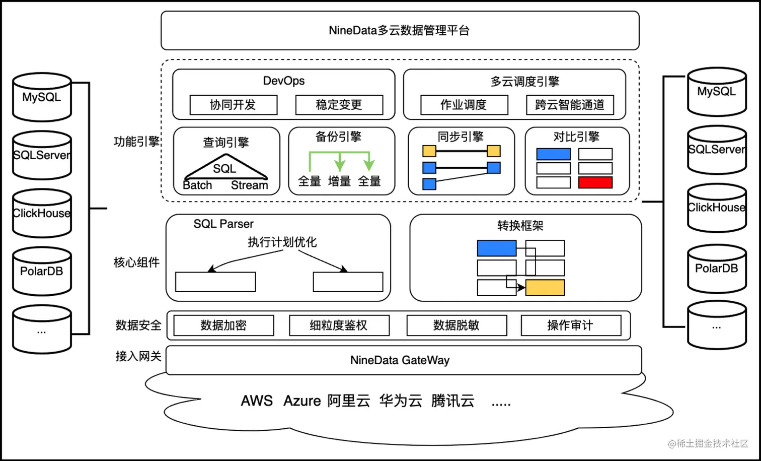 - NineData 是玖章算术推出的多云数据管理平台,提供一套多云、全托管的数据管理服务,该服务包含了 SQL 开发、数据复制、数据备份及数据对比功能。通过这些功能,可以轻松完成日常数据库开发、数据安全访问、生产数据库变更与发布、数据库备份恢复、数据迁移、容灾多活、数据仓库及数据湖构建等核心应用场景。NineData 支持混合云和多云架构下的企业数据管理,大幅降低企业的数据运维难度和成本。