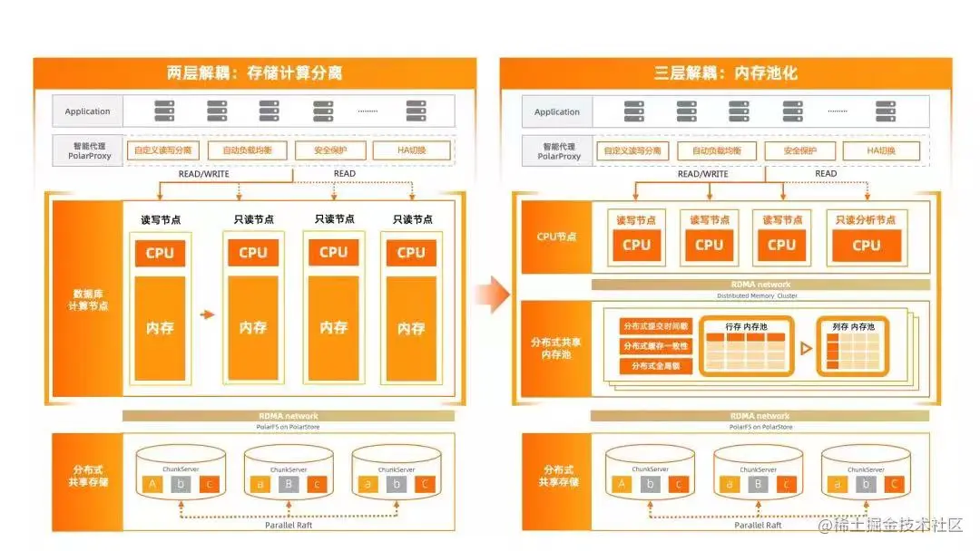 - 阿里云 PolarDB。2015年,阿里云数据库团队下定决心,推动云原生数据库的自研工作。PolarDB100%兼容MySQL、PostgreSQL、高度兼容Oracle语法。 计算能力最高可扩展至1000核以上,存储容量最高可达 100TB。过去几年,阿里云针对 PolarDB 进行了诸多创新,通过采用存储计算分离、软硬一体化设计,PolarDB 实现成本仅为传统商业数据库的十分之一。所实现的计算、内存与存储资源的“三层解耦”架构、多主多写、基于IMCI(内存列存索引)的HTAP、Serverless等功能已是业内领先的技术。