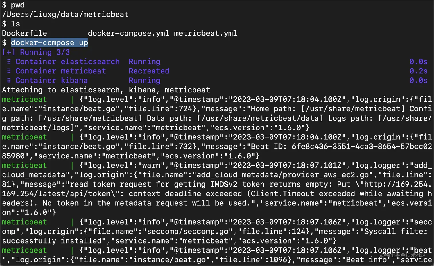 现在摆在我们面前的挑战是……如何更新 elasticsearch-xpack.yml 文件? 好吧……一种方法是我们启动服务,然后通过 telnet / ssh 进入 metricbeat 容器并更新配置文件。例如,我们可以这样来进入到容器中: