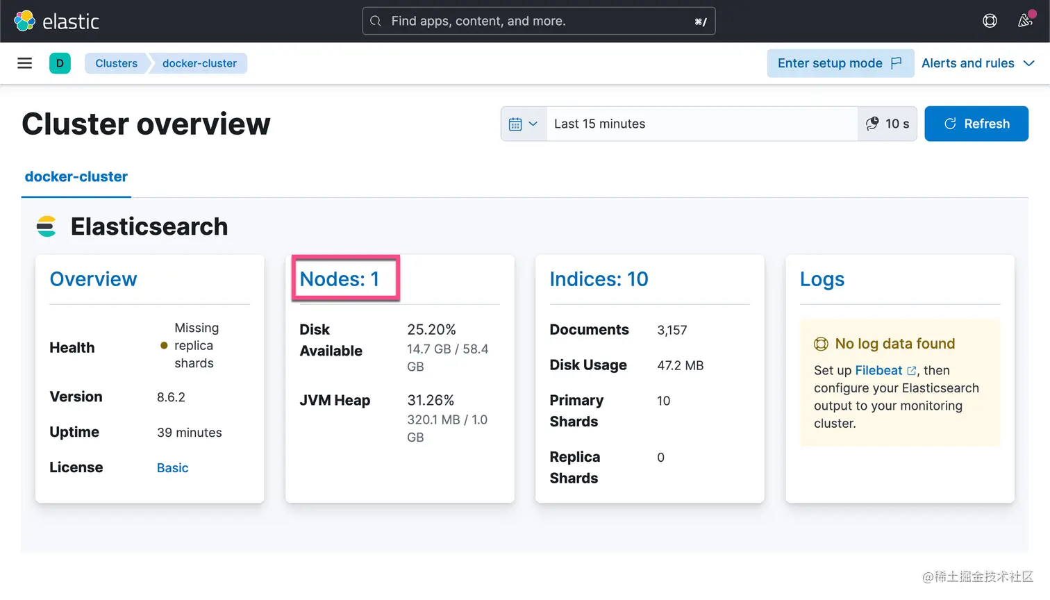 显示操作系统/主机指标非常有用,但有时我们可能也想知道服务器/服务的行为方式。 举个例子,我们可以监控我们的 elasticsearch 节点的健康状况吗? 如果您现在点击 “Stack Monitoring” 应用程序,将显示此页面:
