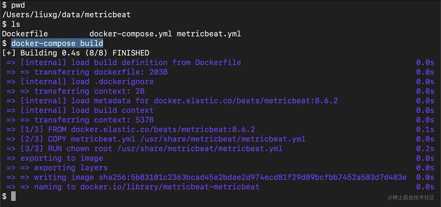 这很简单,我们将基础 docker 镜像设置为 docker.elastic.co/beats/metricbeat:8.6.2。 然后我们将自定义的 metricbeat.yml 复制到镜像的 /usr/share/metricbeat 路径下。 最后使用 root 用户更改 metricbeat.yml 的访问权限并完成。