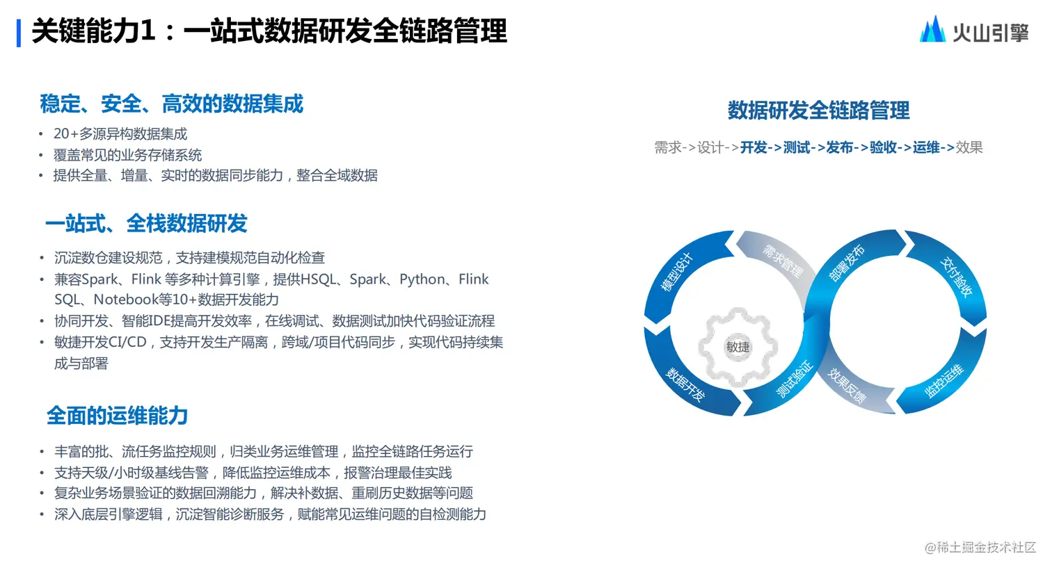 首先能提供稳定、安全、高效的数据集成服务,支持 20 +以上多元异构数据集成;其次能提供一站式、全栈数据研发服务,兼容 Spark、Flink 等多种计算引擎,提供 HSQL、Spark、Python、Flink 、SQL、Notebook 等 10+数据开发能力;最后是全面的运维能力,丰富的批、流任务监控规则,归类业务运维管理,监控全链路任务运行。