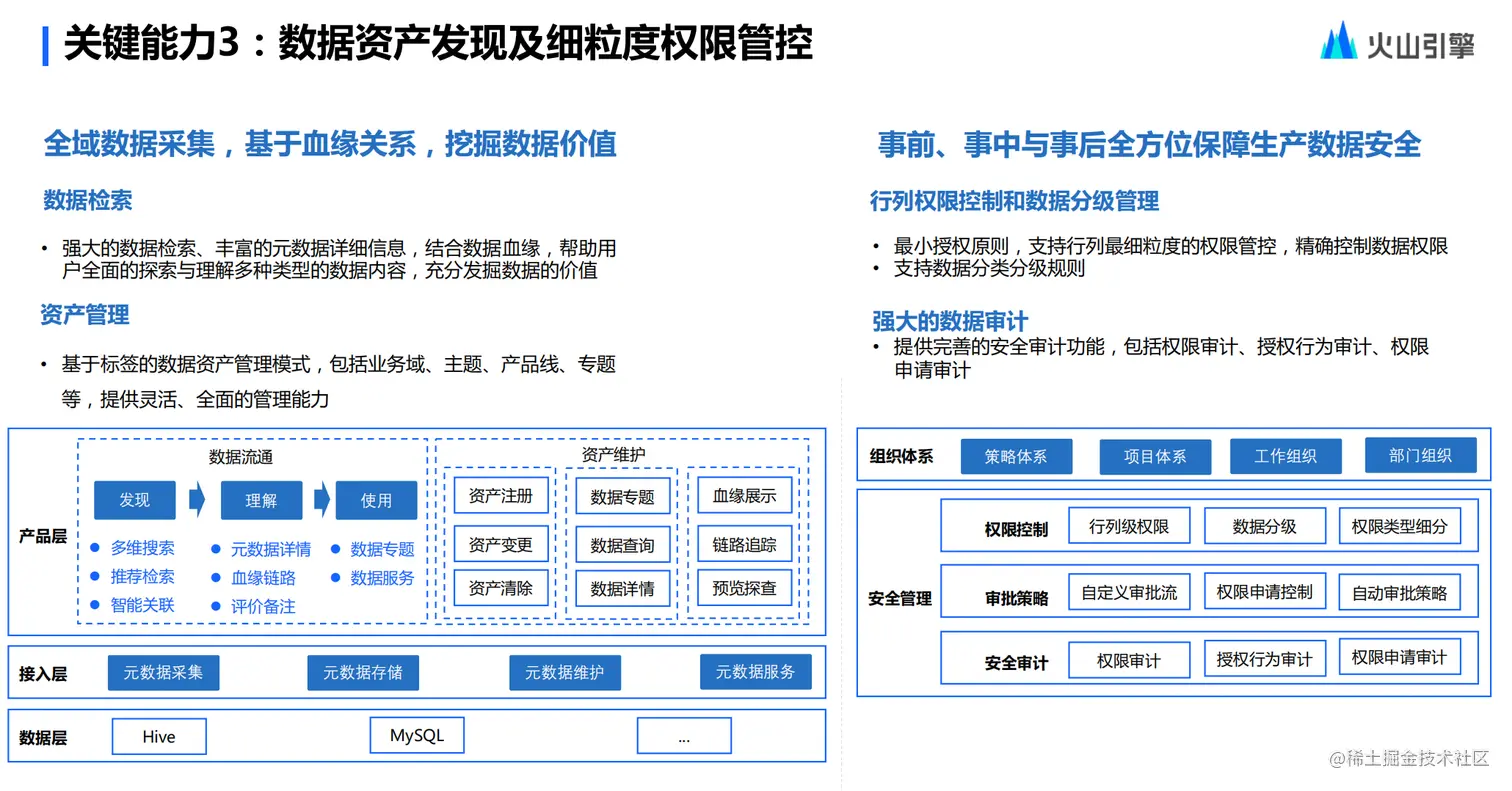 第三个关键能力是数据资产发现以及细粒度权限管控,它主要是提供了痊愈的数据采集,基于血缘能够展示出来所有的元数据,能够挖掘数据价值,能够找数、用数等。数据资产提供了强大的检索能力。并且 DataLeap 有很丰富的元数据的详情信息,结合数据血缘,帮助用户能够全面地探索和理解各种各样的数据内容。