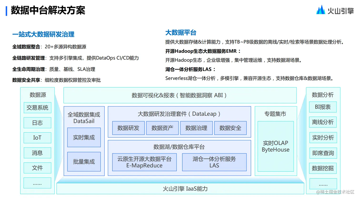 大数据平台是一个底座,提供的是数据的存储和计算能力,支持像 TB 到 PB 级的离线,实时检索各种场景。它有两个引擎,一是基于开源 Hadoop 生态的 EMR,支持数据湖场景,二是火山引擎自研的湖沧一体分析服务 LAS,兼容开源生态,支持数据仓库 &数据湖场景。