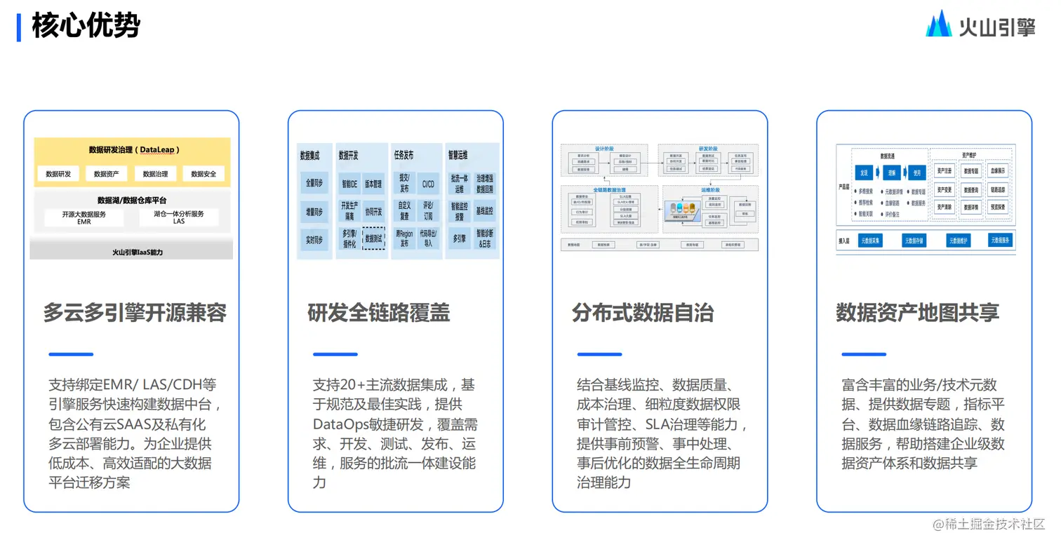 第一是 DataLeap 是能够和多云多引擎开源兼容的一个大数据治理平台的软件产品,刚才提到的像 EMR 、LAS 这种平台。 从产品形态上来看,DataLeap 提供公有云的 SaaS 以及私有化多云部署的能力。在研发上,实现了研发全链路覆盖,这是一整套完善的能力。第三是字节特色的分布式数据自治, SLA 细粒度的权限管控,事中事前、事中事后的全生命周期的数据治理的能力。第四个优势是数据资产、地图共享,提供数据专题,指标平台、数据血缘链路追踪、数据服务,帮助搭建企业级数据资产体系和数据共享。