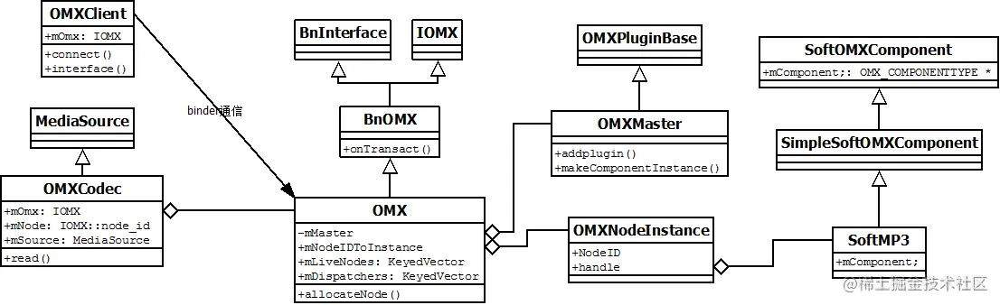 这里OMX Codec是以service的方式提供服务的。Awesomeplayer中通过mOmx(IOMX) 作为客户端通过binder方式与OMX 通信完成解码的工作。