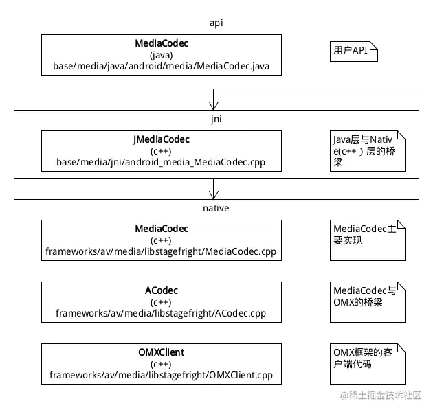 与Android其他API类似,MediaCodec主要分为API、JNI、Native、Server四个部分。