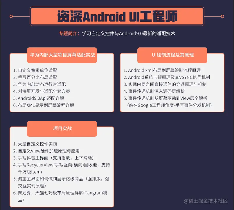 很多人在刚接触这个行业的时候或者是在遇到瓶颈期的时候,总会遇到一些问题,比如学了一段时间感觉没有方向感,不知道该从那里入手去学习,对此我针对Android程序员,我这边给大家整理了一套学习宝典!包括不限于高级UI、性能优化、移动架构师、NDK、混合式开发(ReactNative+Weex)微信小程序、Flutter等全方面的Android进阶实践技术;希望能帮助到大家,也节省大家在网上搜索的时间来学习,也可以分享动态给身边好友一起学习!