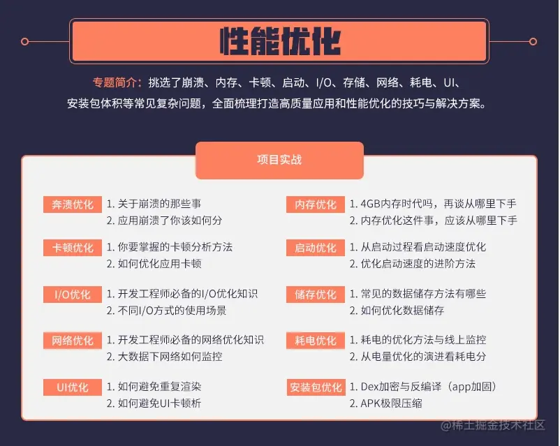 所以性能优化专题针对想进入大型BAT公司,对项目的运行效率不是很满意的开发者朋友,增加APP发版之后的运行体验,让你面试可以如云流水的答出答案。