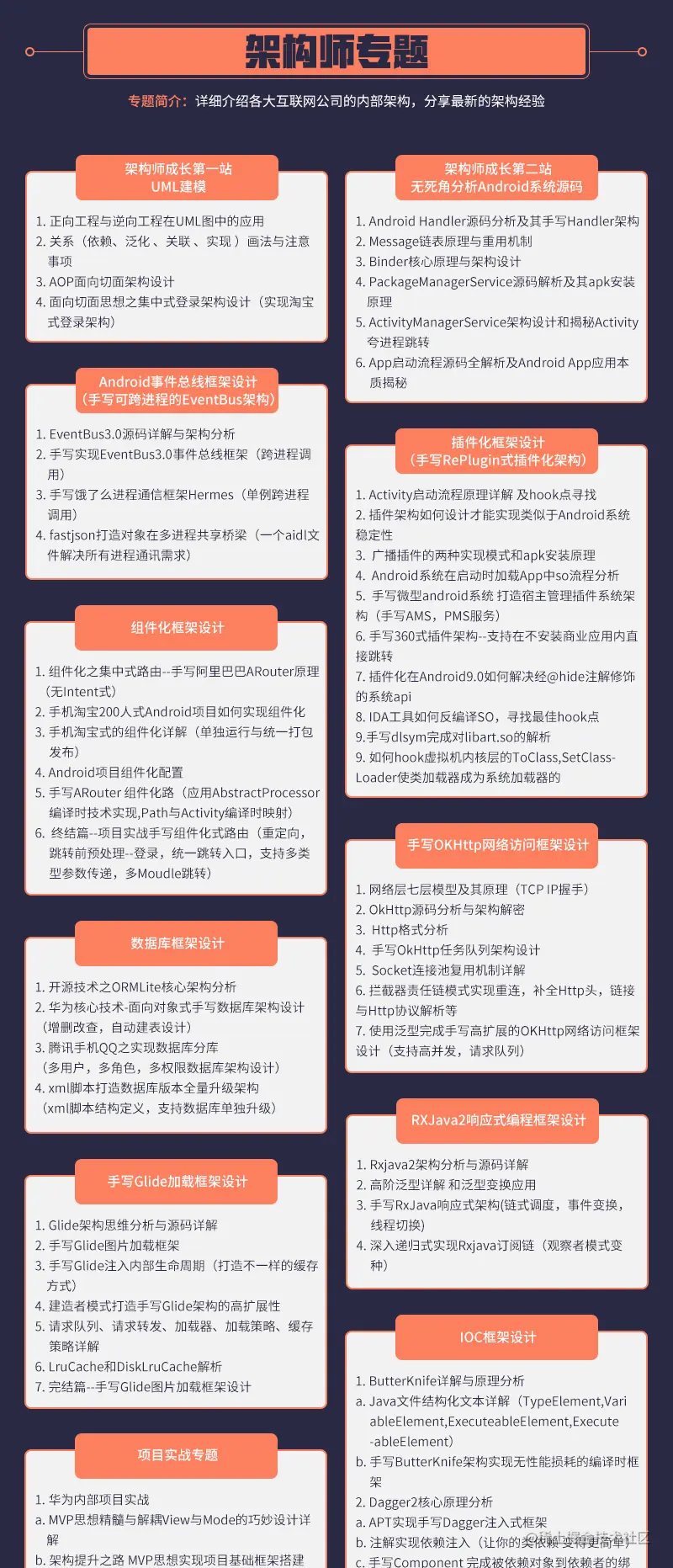 想要掌握复杂的技术,必须要理解其原理和架构。本模块结合实际一线互联网大型项目理解架构思维,抽丝剥茧,层层深入,帮助大家成为Android架构师,在思想上对架构认识有一次升华,并知其所以然,把别人的架构思想学以致用