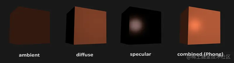 现实世界的光照是极其复杂的,而且会受到诸多因素的影响,这是我们有限的计算能力所无法模拟的。因此OpenGL的光照是基于现实的近似,使用的是更容易处理和看起来相对相似的简化模型。这些光照模型都是基于我们对光的物理特性的理解。其中一个模型被称为冯氏光照模型(Phong Lighting Model)。冯氏光照模型主要由3个分量组成:环境(Ambient)、漫反射(Diffuse)和镜面(Specular)光照。下面这张图展示了这些光照分量看起来的样子: