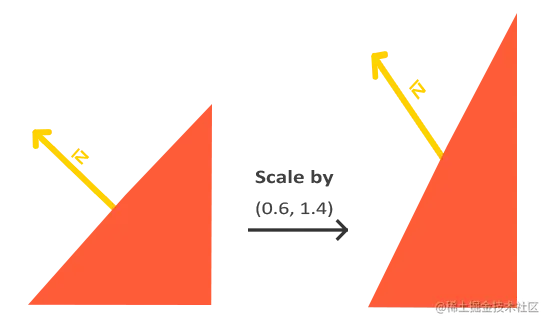 其次,如果模型矩阵执行了不等比缩放,顶点的改变会导致法向量不再垂直于表面了。因此,我们不能用这样的模型矩阵来变换法向量。下面的图展示了应用了不等比缩放的模型矩阵对法向量的影响: