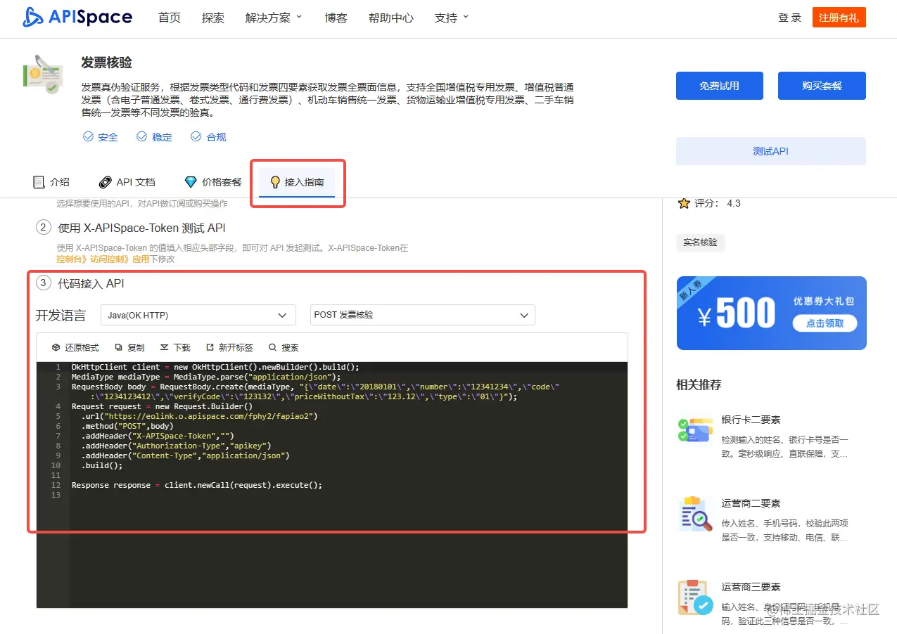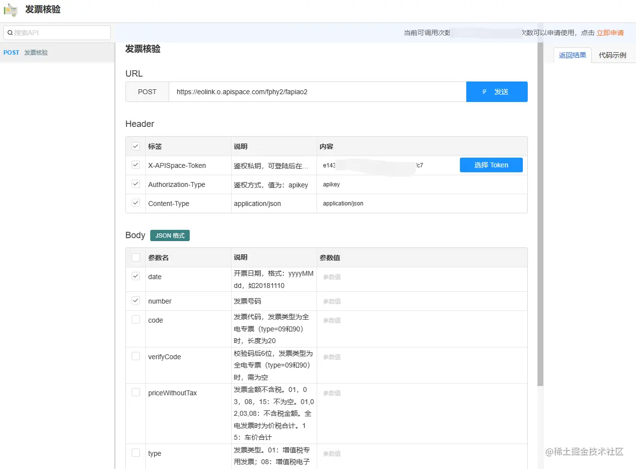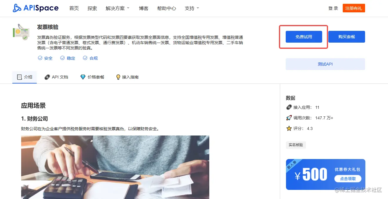 1.注册登录 APISpace,进入发票核验详情页,点击【免费试用】按钮即可领取免费次数