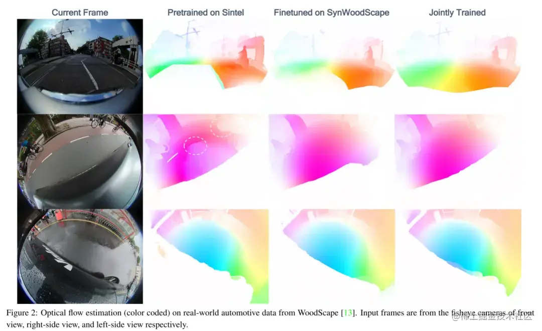 图2:WoodScape [13]中真实汽车数据的光流估计(颜色编码)。输入帧分别来自前视图、右视图和左视图的鱼眼相机。